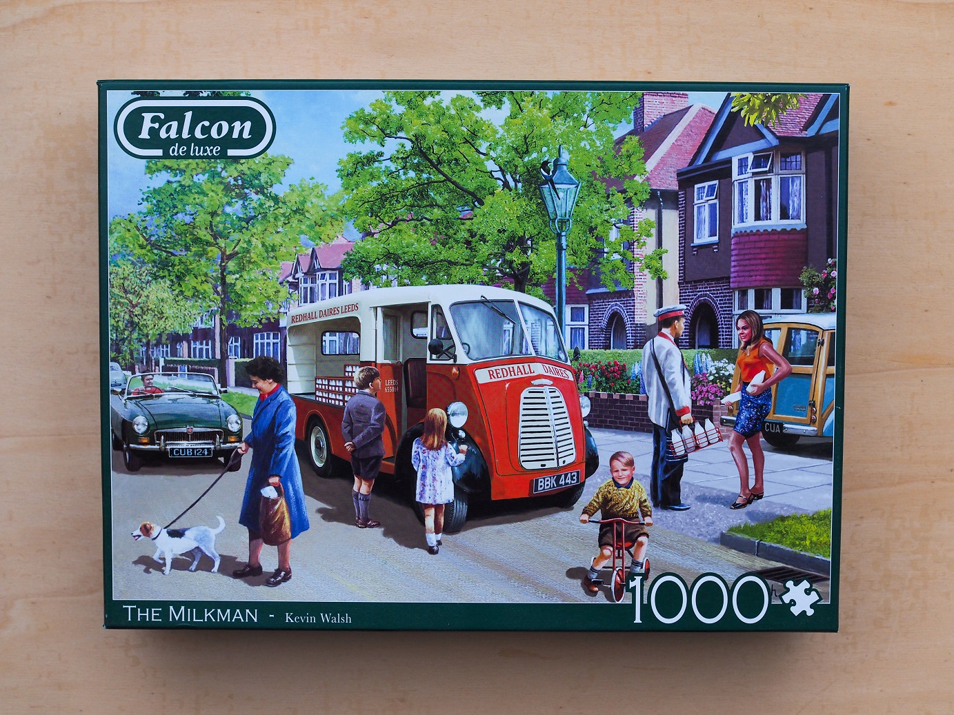 Ein typisches Alltags-Szenen-Puzzle von Falcon de Luxe. Es zeigt eine Szene von früher, als der Milchmann mit seinem Wagen noch durch die Stadt gefahren ist und die Leute aus der Straße angezogen hat.